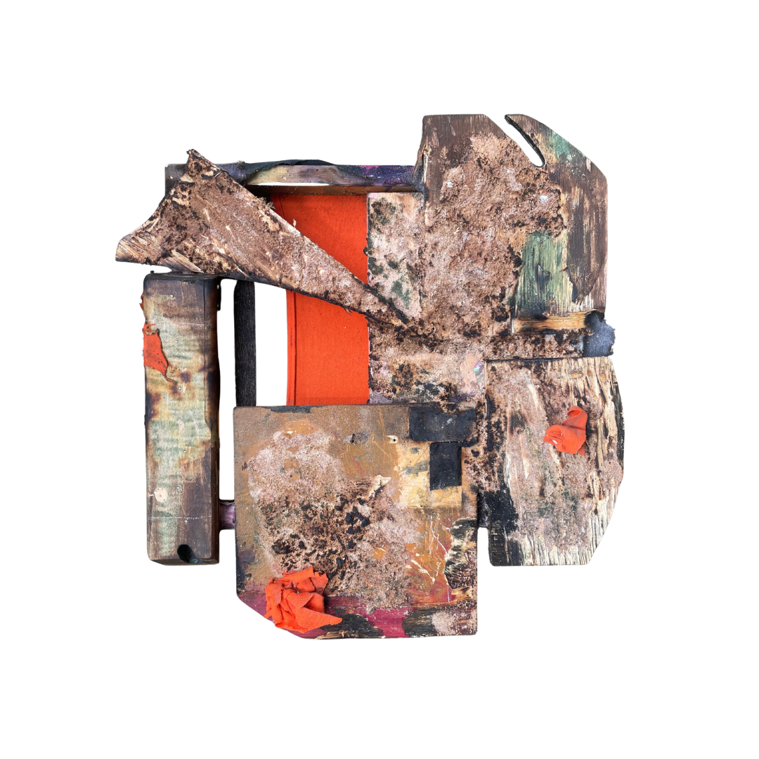 18”x20” | I Don’t Have Answers Series | Built from reclaimed poplar wood, plywood, sawdust, reclaimed t-shirt, wood stain