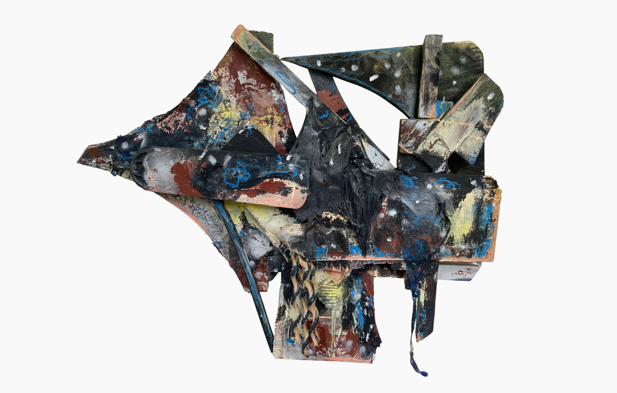 Mixed Media made from reclaimed wood, ceiling fans, cotton string, scrap epoxy, acrylic, oil pastels, spray paint, enamel paint, wood stain, and sawdust